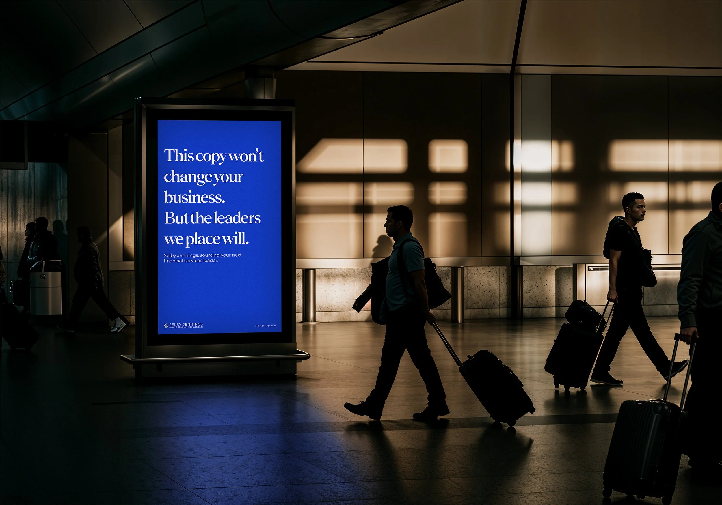 In some of London’s busiest transport hubs and financial districts, most advertising competes for attention. We decided to do the opposite. For Selby Jennings, we created a campaign that turns the billboard on itself: a series of headlines that highlight what advertising can’t do and what great recruitment can.